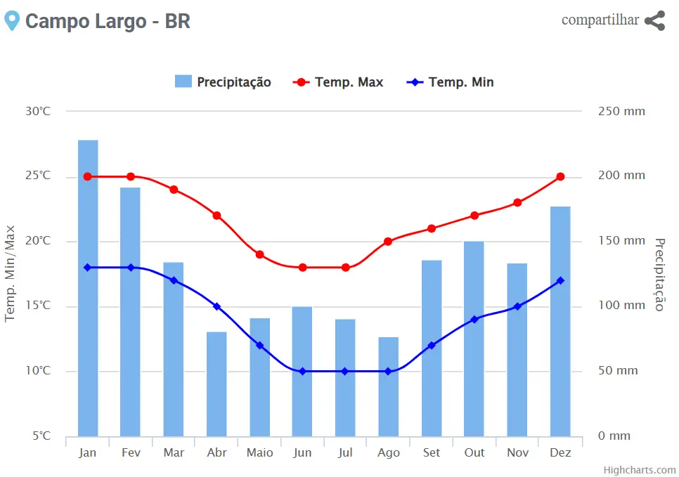 Campo Largo tem clima subtropical de altitude, com verões amenos e invernos frescos; as noites podem ser significativamente mais frias que os dias.