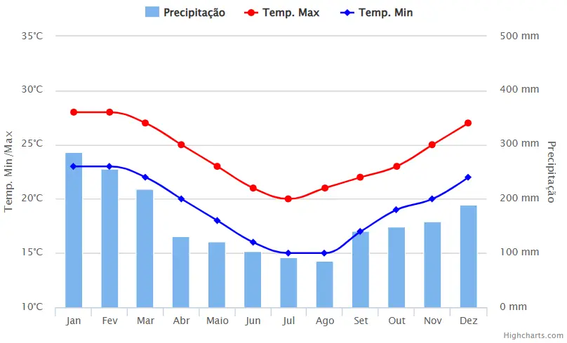 Temperaturas máximas no verão costumam ficar perto de 28–29°C, enquanto as mínimas no inverno giram em torno de 14–17°C, variando conforme frentes frias.